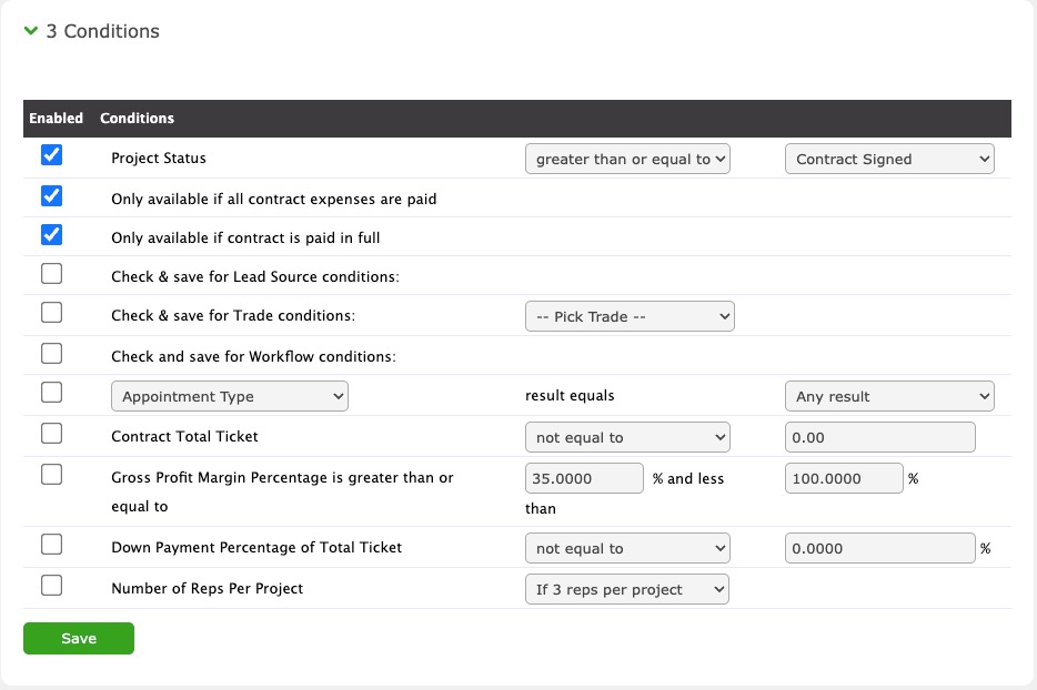 Project Status - This allows you to set a time for when the payout is available. NOTE: Be mindful of the operator you set (i.e. greater than, less than, equal to, etc.) If you set the operator to equal to, that payout will only be available when the project status is equal to what you set. If you wish to have the payout available any time after the project status you set, you may want to use greater than or greater than or equal to. Please view the Payouts/Commissions lesson within the Knowledge Base for examples.