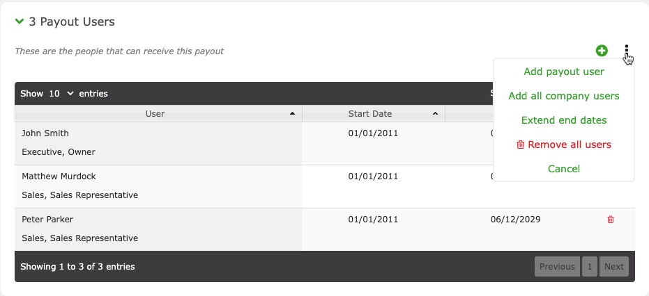 Now that you have created a payout rule, it is time to assign users to that rule. The reason you need to assign users is for the fact that some users may not qualify for that rule. For instance, let's say you have some reps that receive 30% of the net profit and some that receive 40% of the net profit. In this case you would create a rule for the 30% reps and another rule for the 40% reps.