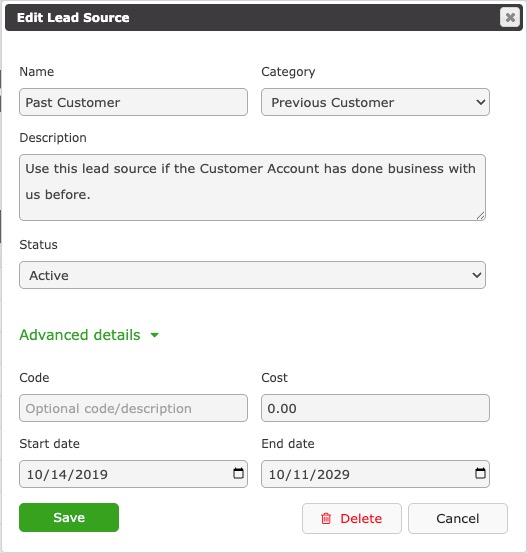 An optional description for the Lead Source. It is always helpful to add a description letting Users know how this Lead Source is used and what it is intended for.