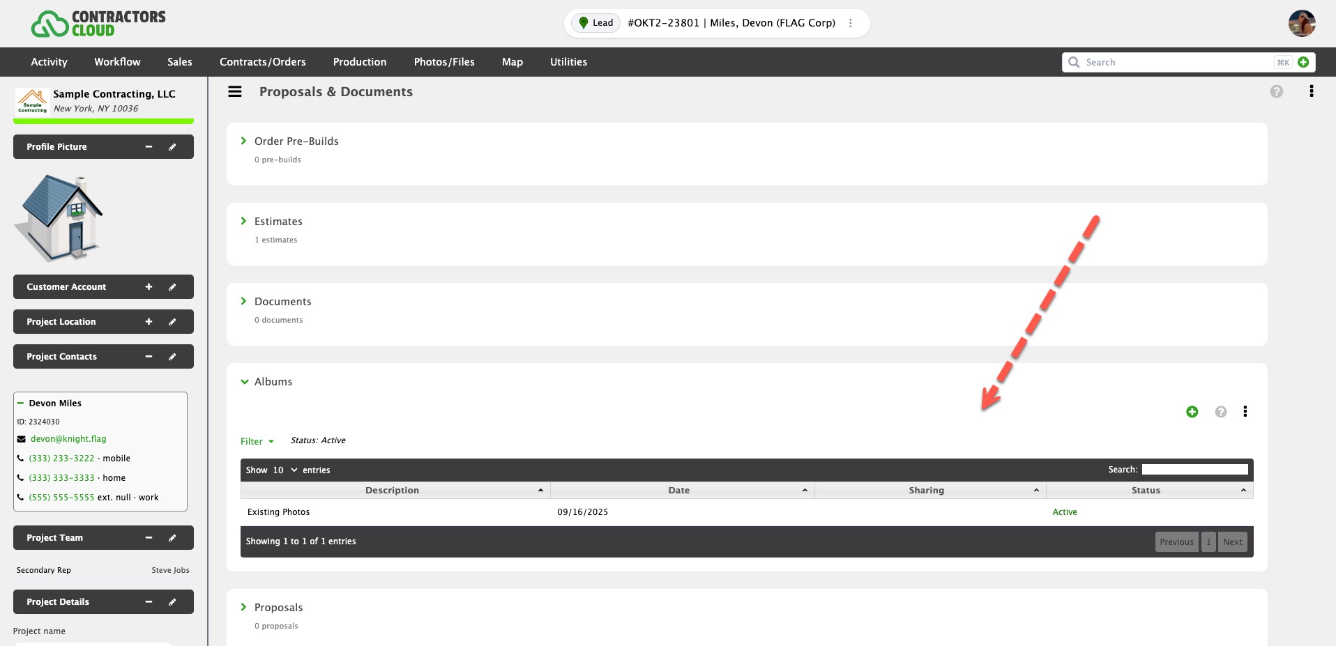 Albums are collections of uploaded photos and can be attached to Proposals. Albums are also managed in the Project Photos/Files menu item.