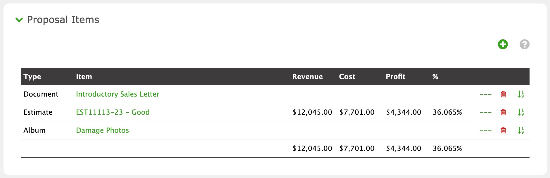 Proposal Items are a combination of Documents, Estimates, and Albums.