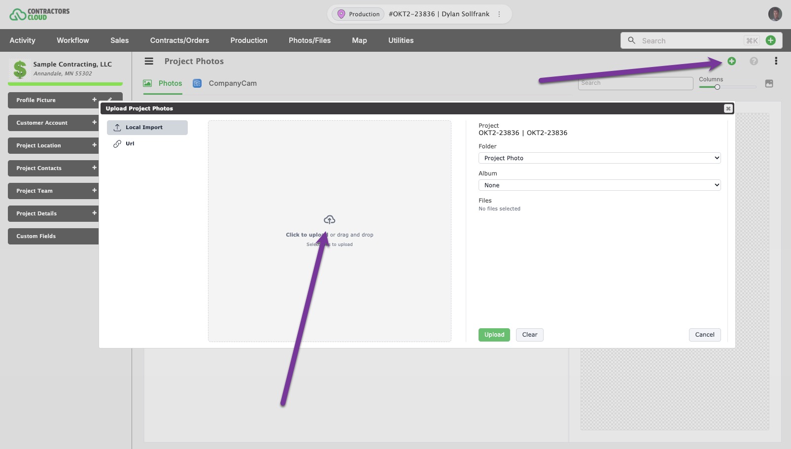 To upload photos, click the green circle plus icon, set folder and album if applicable, and click Click to Upload or drag photos into the grey box.