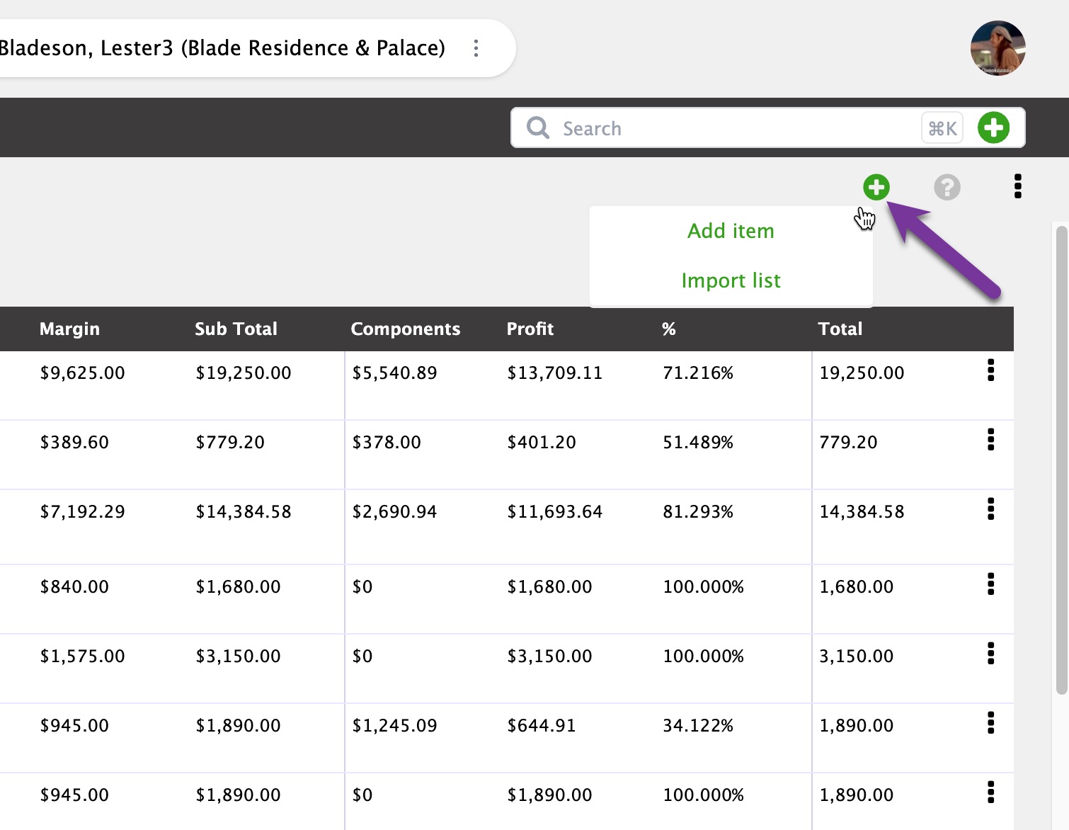 Click the green circle plus to add a single Estimate Item or Material List.