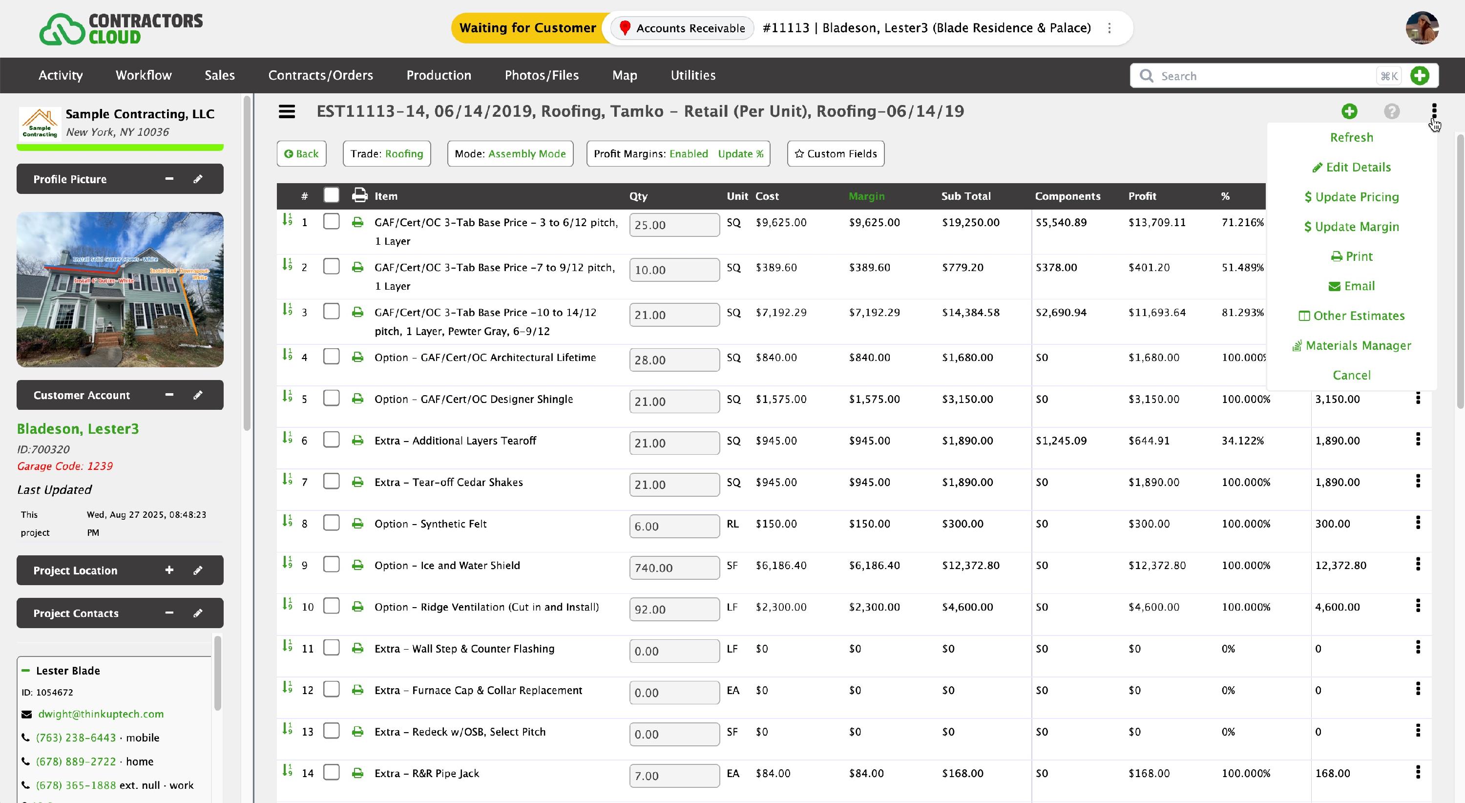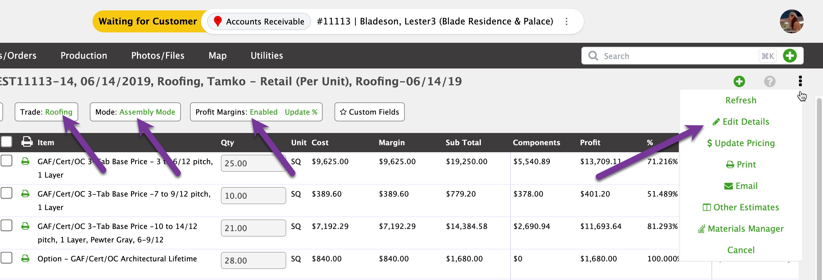 - Update Margin - If Profit Margins are enabled, click this (or the green Margin headers), to blanket update the profit margin of each Estimate Item.