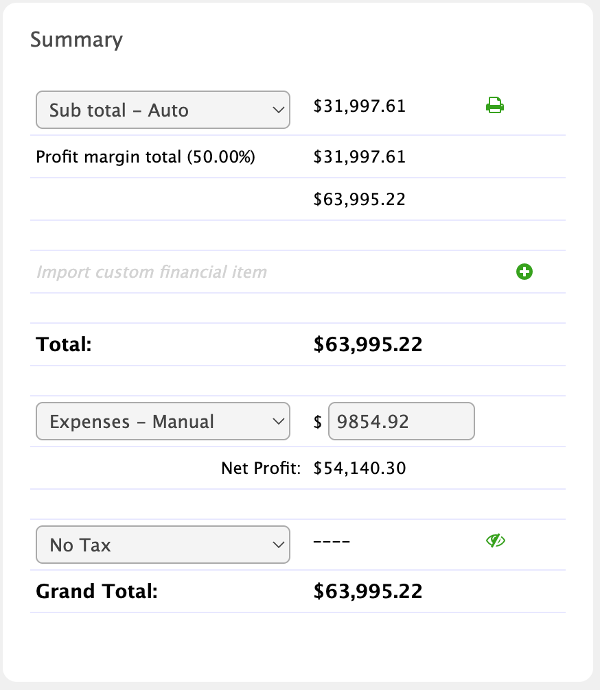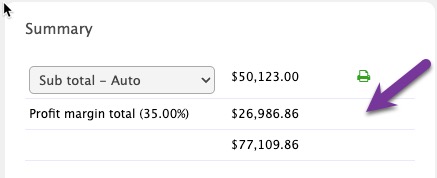 This shows the total profit margin of all estimate items. The Profit Margin summary is only available in Sub total - Auto mode and Profit Margin functions are enabled for the estimate ( see Estimate Details).