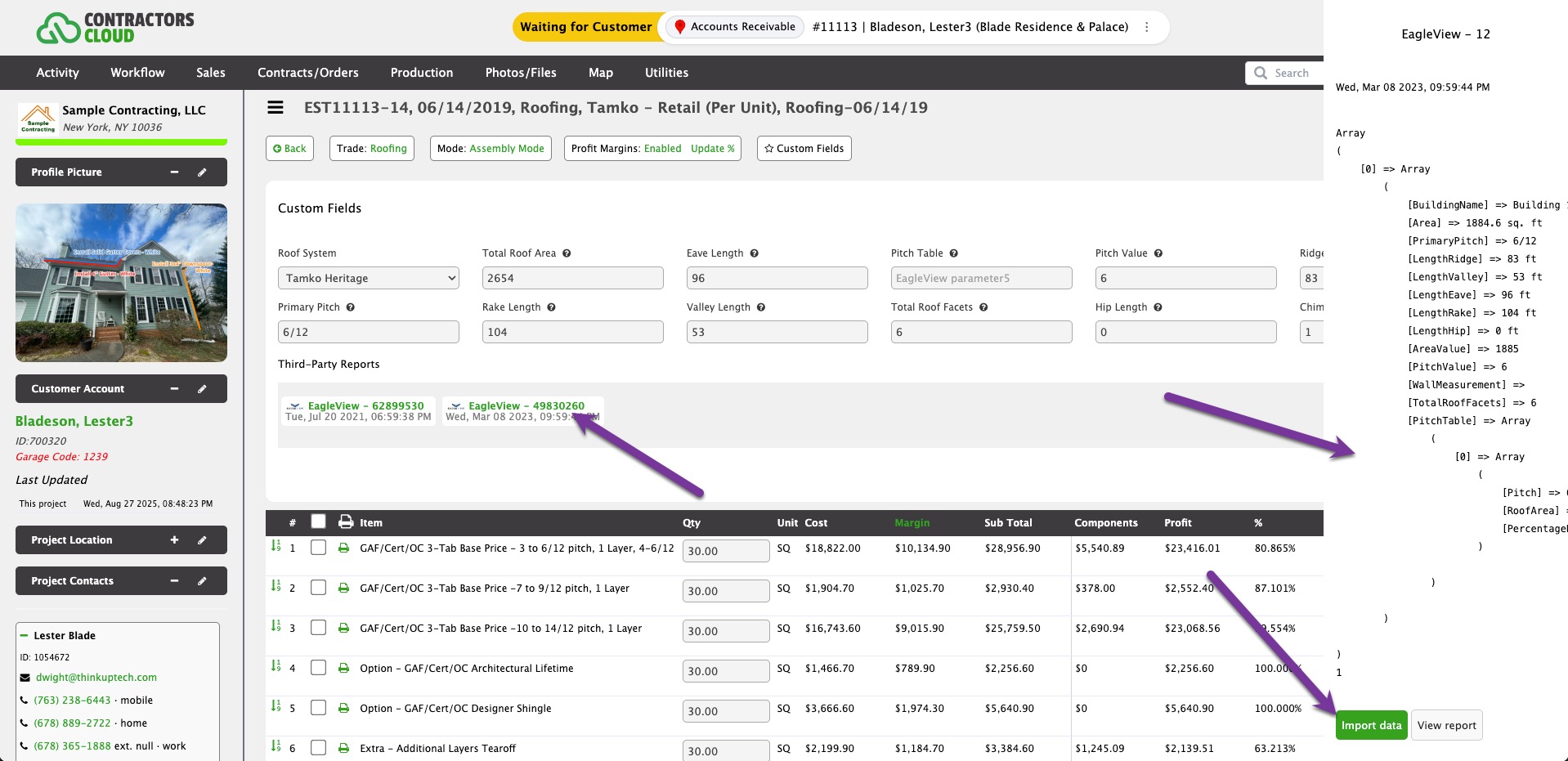 Any third-party reports for the Project will be listed here. Click a report to view the raw measurement data. Click Import Data to import the report data into the Estimate Custom fields.