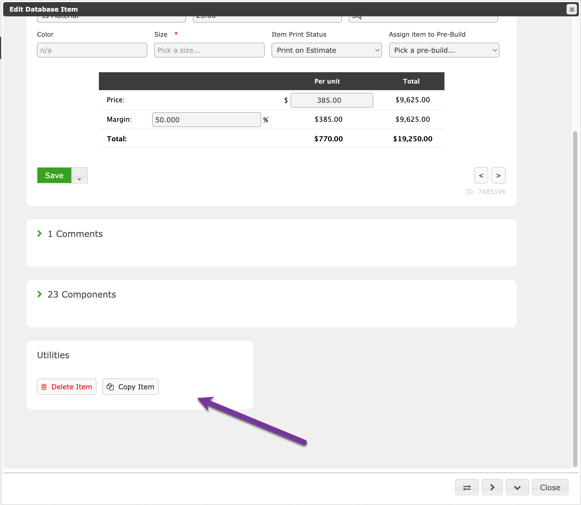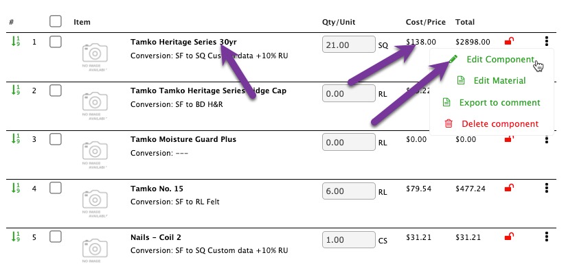 Edit Component - Opens the Estimate Item Component interface.
