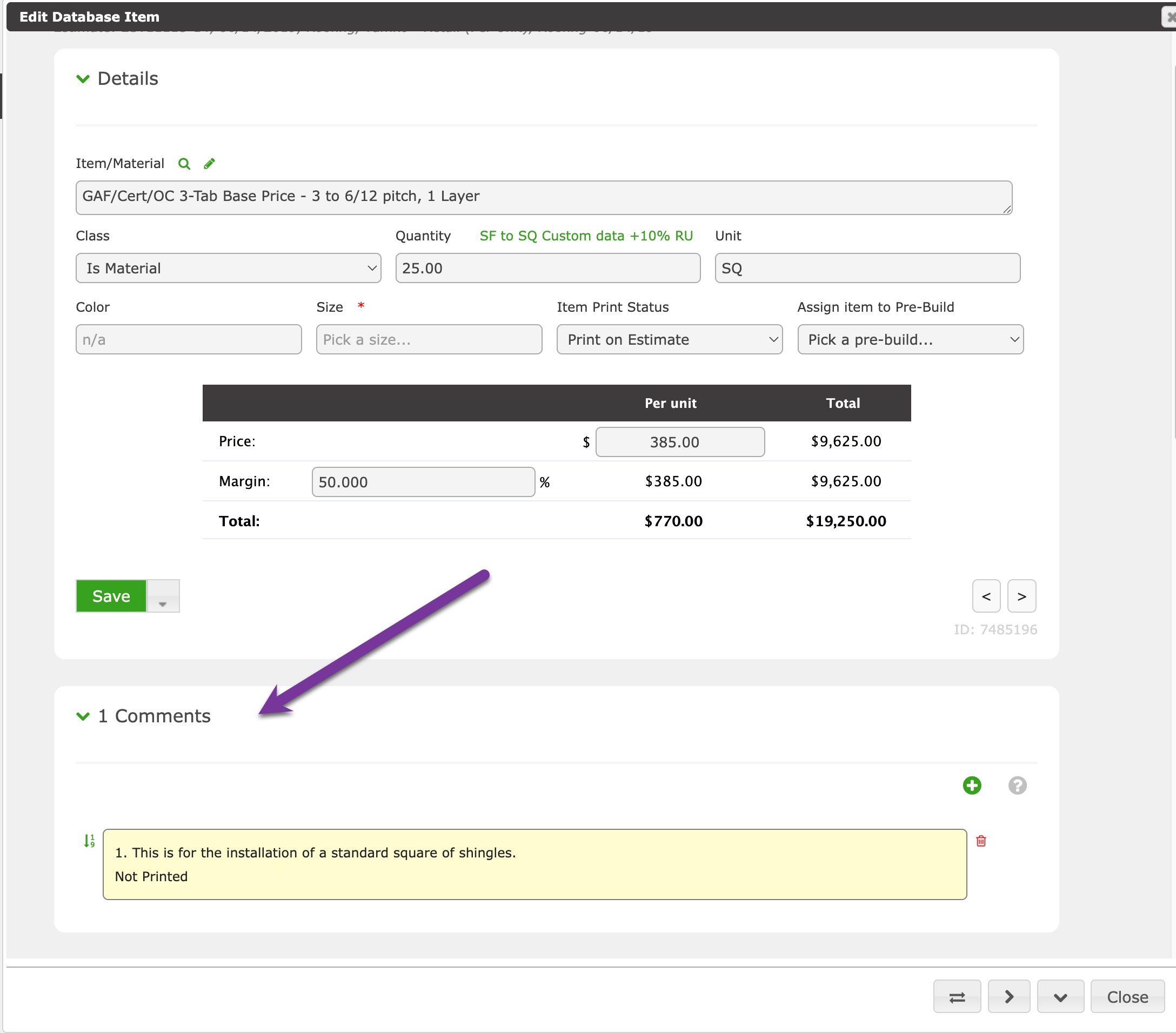 - Print on Estimate - This Estimate Item, and printable comments, will be printed as a line item within the Estimate print-out.