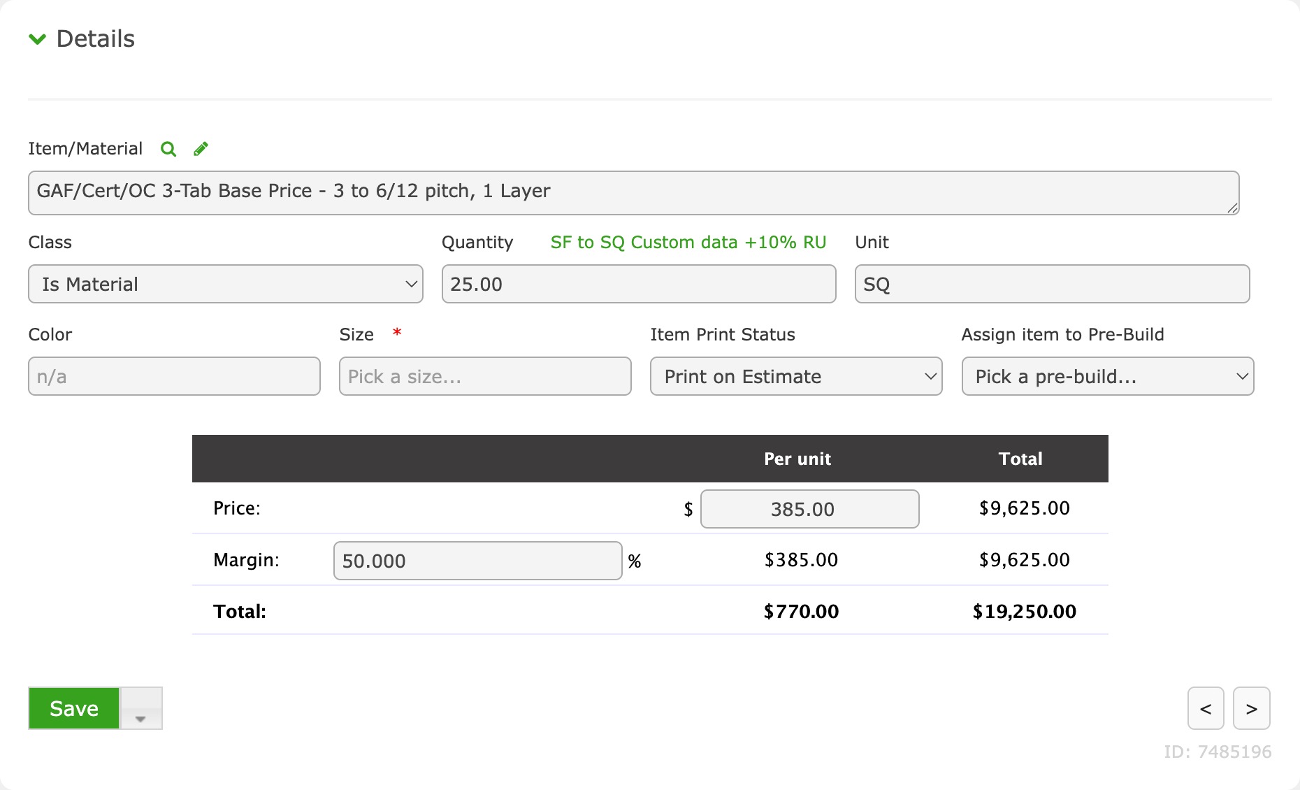This is where all dollar amounts related to the Estimate Item are managed.