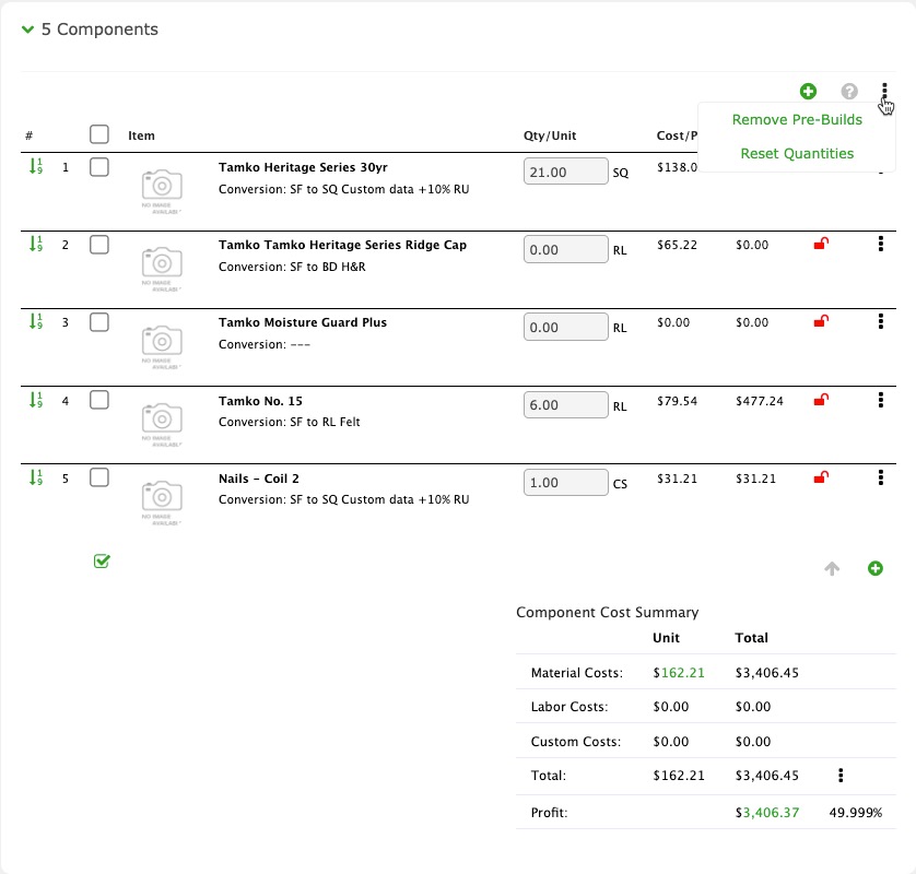 Reset Quantities - This resets the quantity for each unlocked Estimate Item Component using whatever Material Conversion the component possesses.
