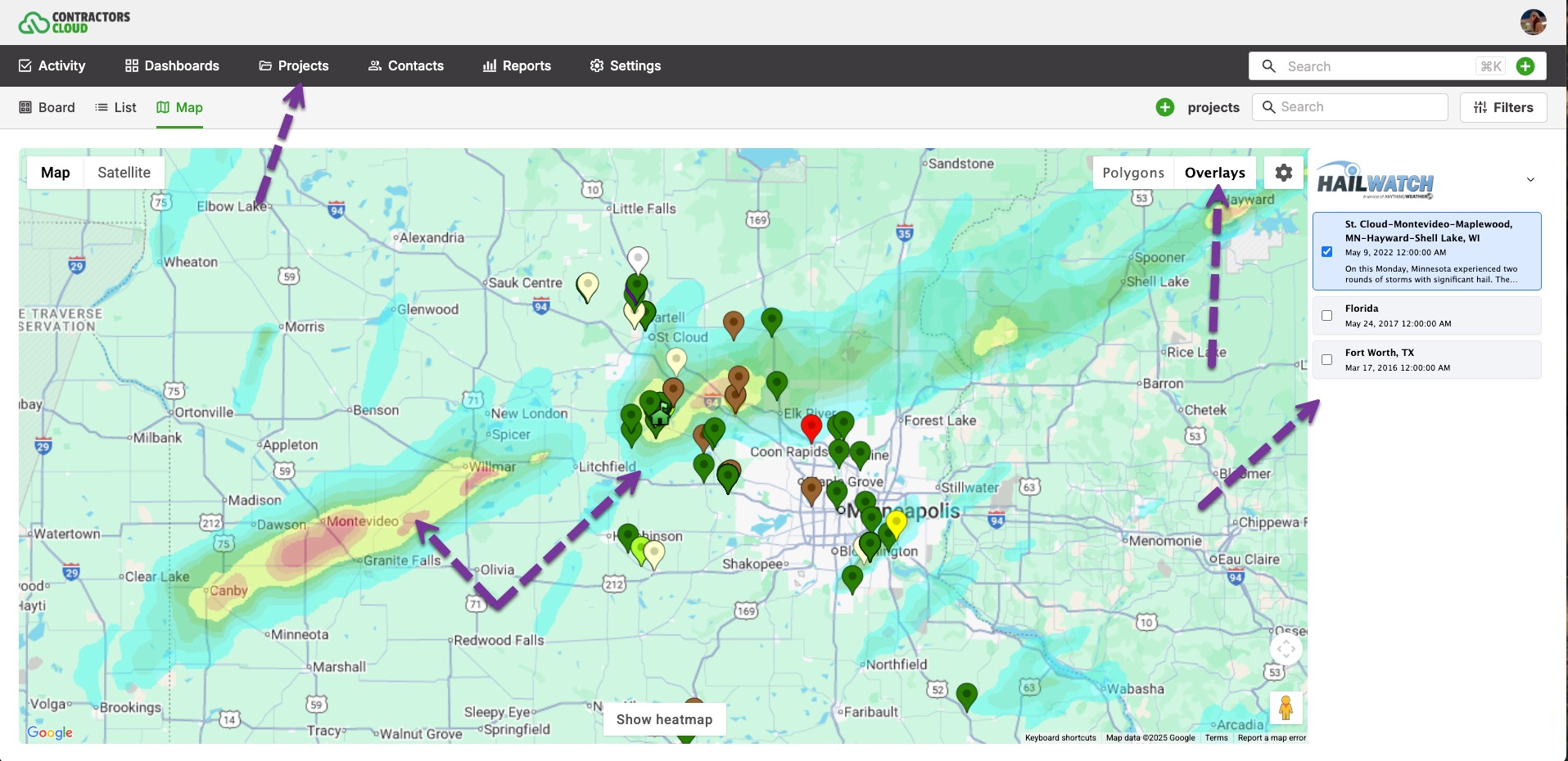 Any purchased HailWatch hail swaths are found in the Overlays section of the Projects (old File Cabinet) map and any Project map for the Company. When checked, the HailWatch swath will appear on the map and can be compared to project markers.