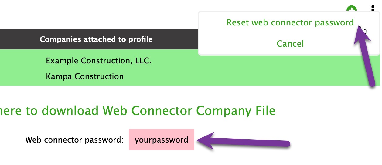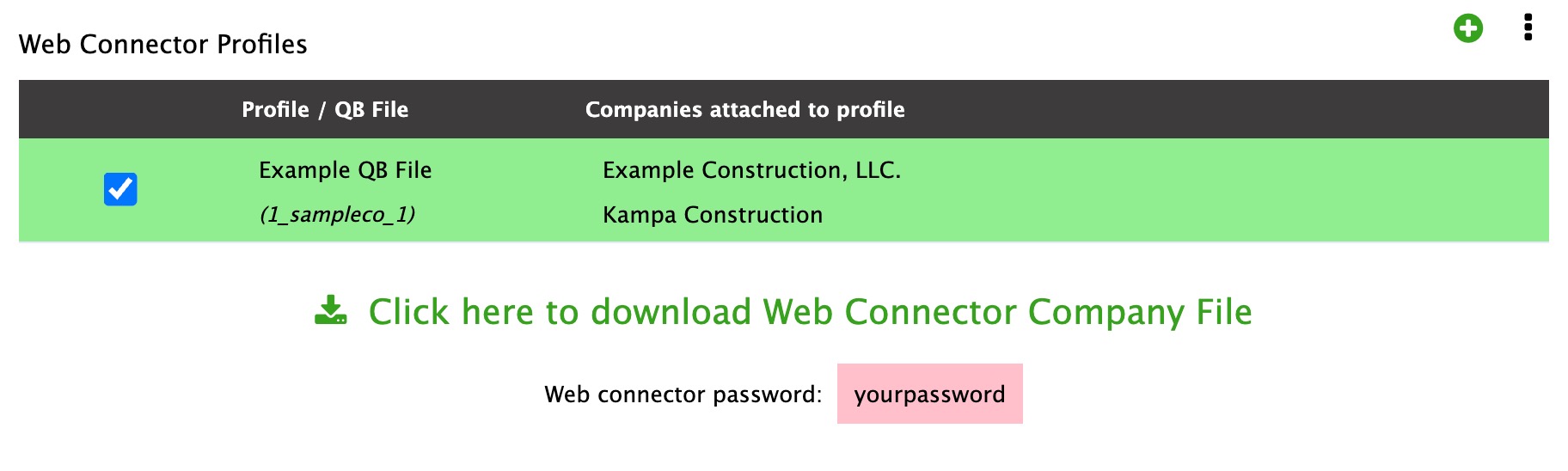 A Web Connector Profile tells the QuickBooks company file what Contractors Cloud company, or companies, to pull data from. A Profile allows multiple Contractors Cloud Companies to connect to a single QuickBooks desktop file.