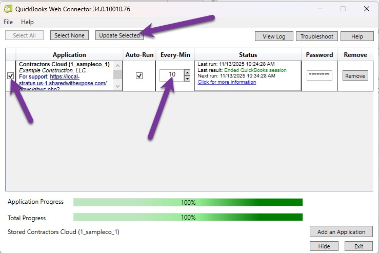 Now, the QuickBooks Web Connector window will appear with the Contractor’s Cloud application