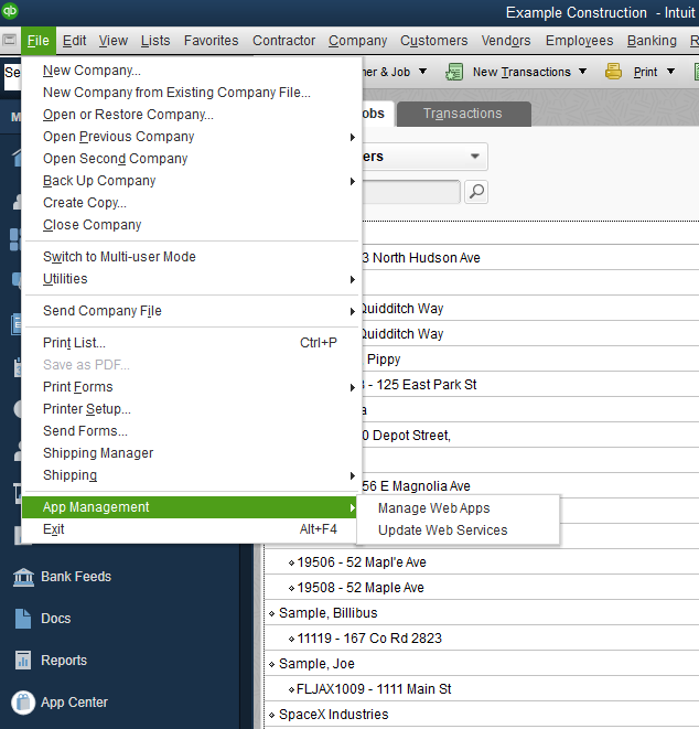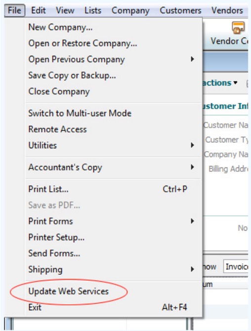 Open the web connector by going into QuickBooks, click the File menu option, Update Web Services.
