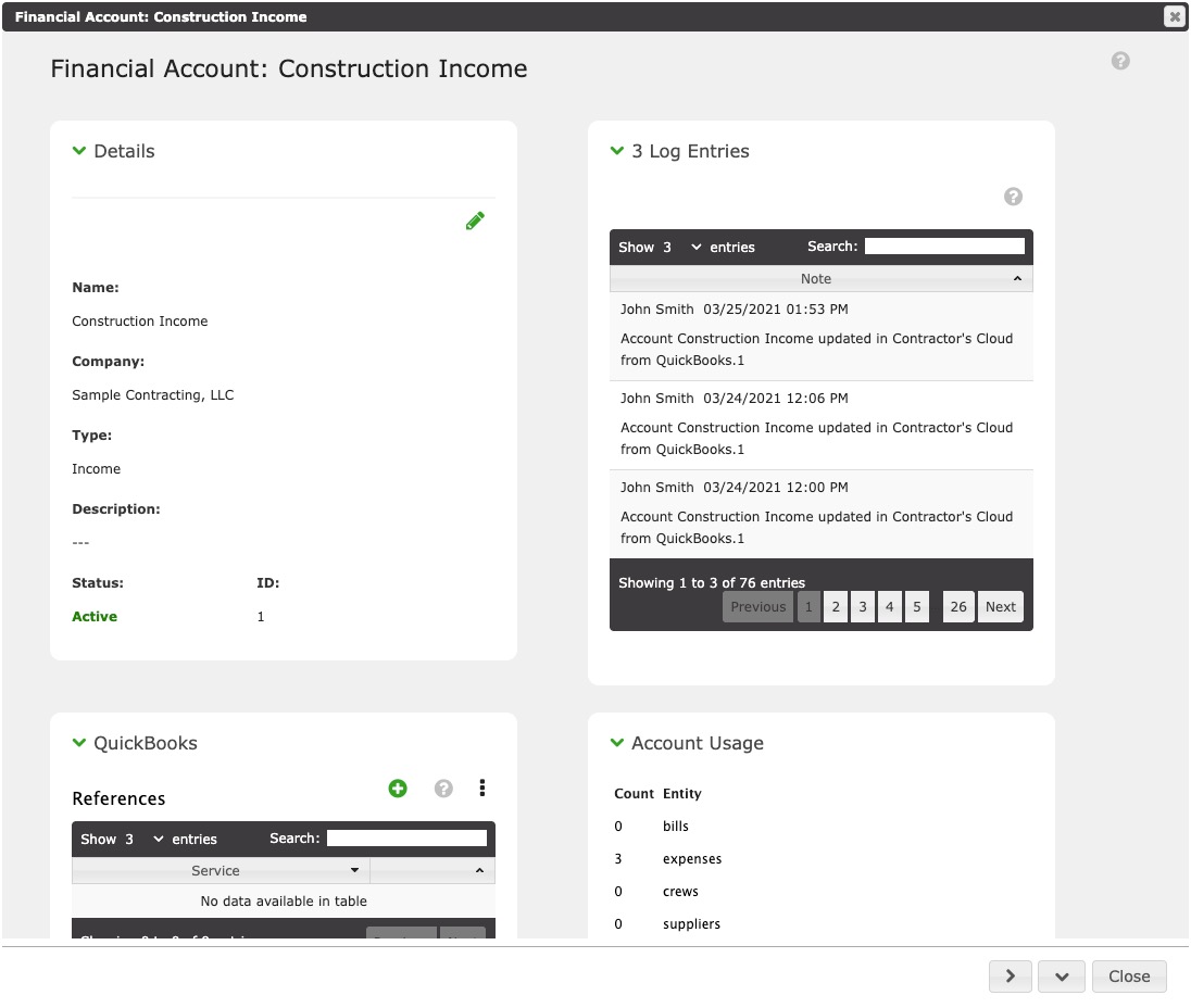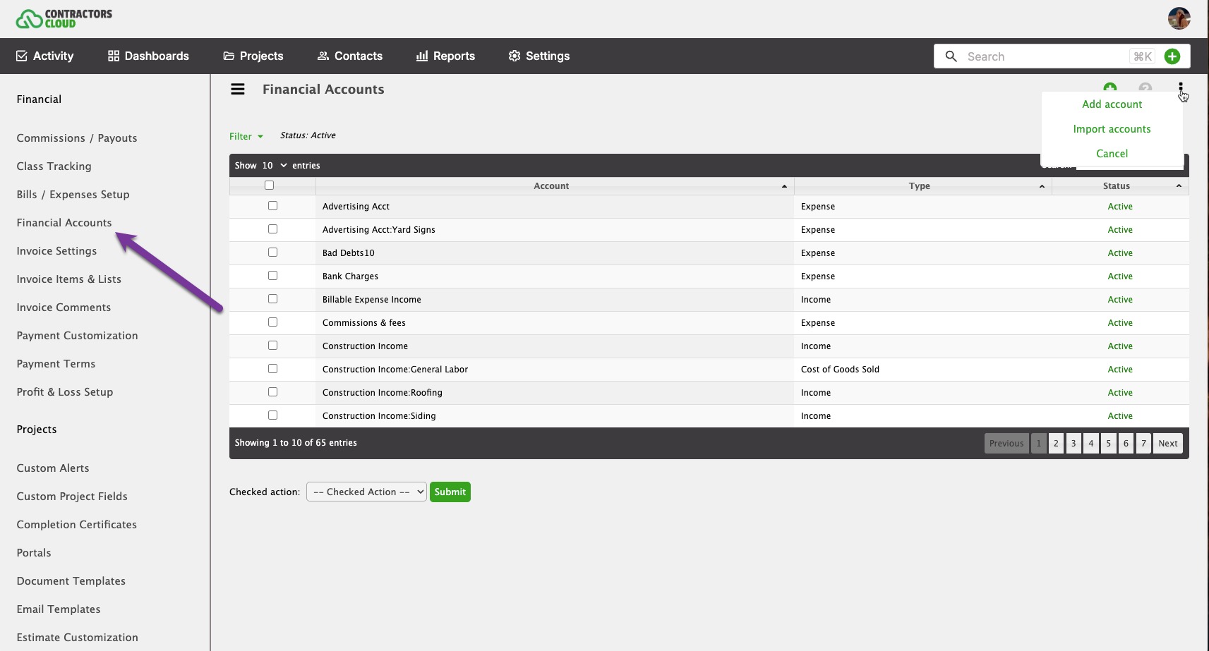 If you are connected to QuickBooks Online, you can easily import your QuickBooks Financial Accounts into Contractors Cloud. See the QuickBooks section below.
