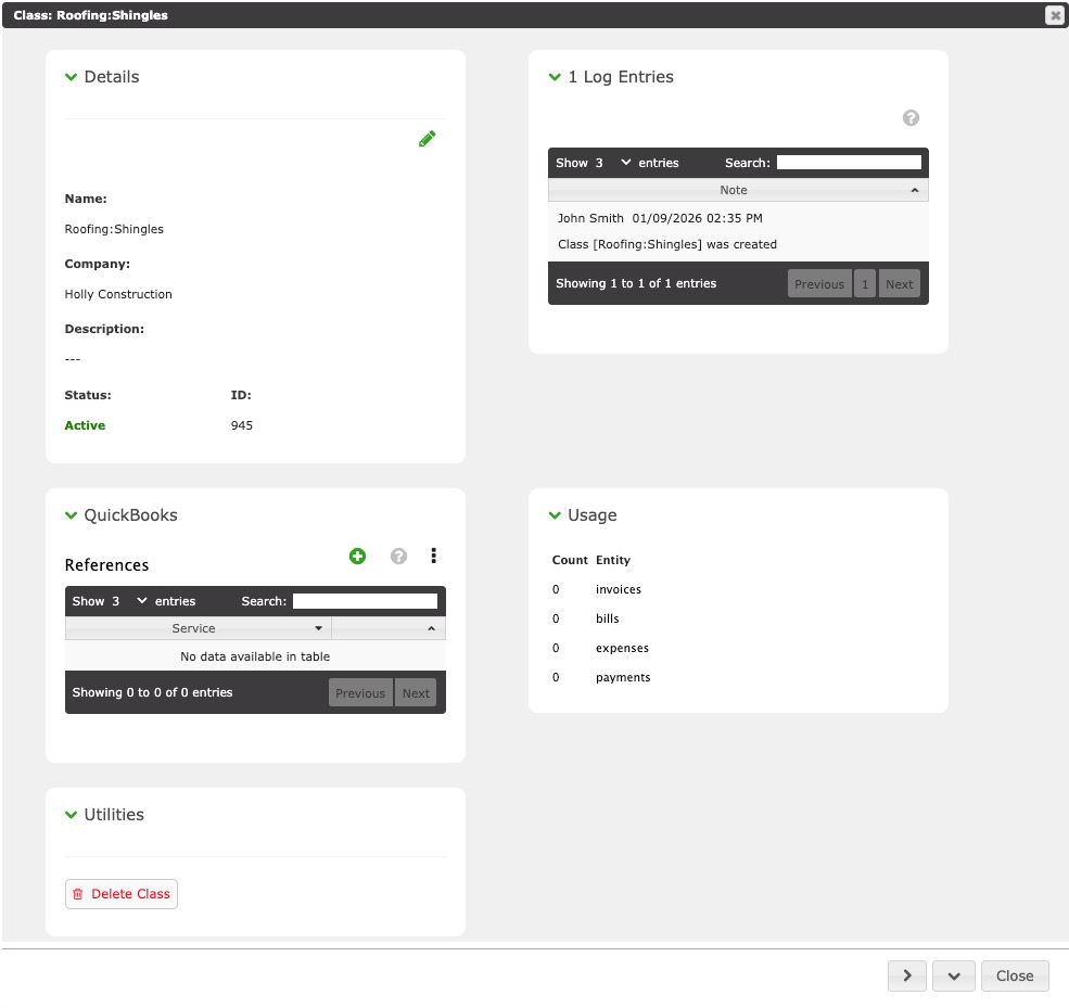 This shows QuickBooks data related to the Class.