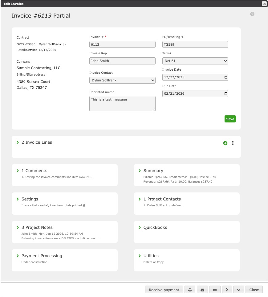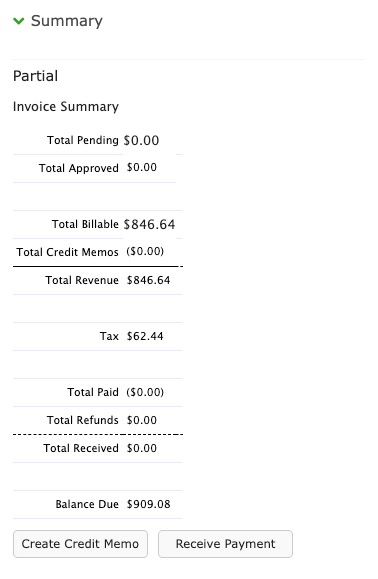 This is the financial summary for the Invoice. Related transactions such as Credit Memos, Payments, and Refunds are accessed here.