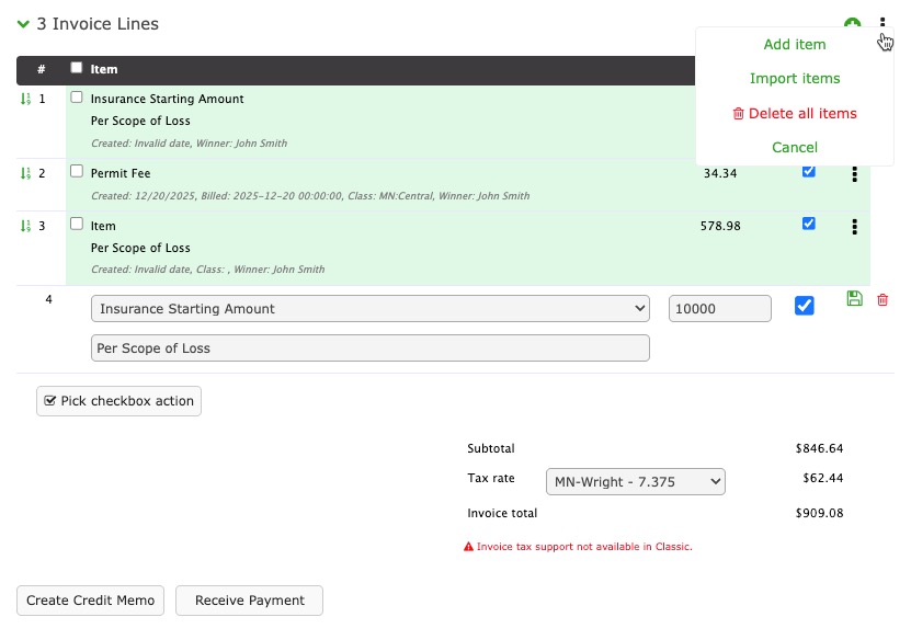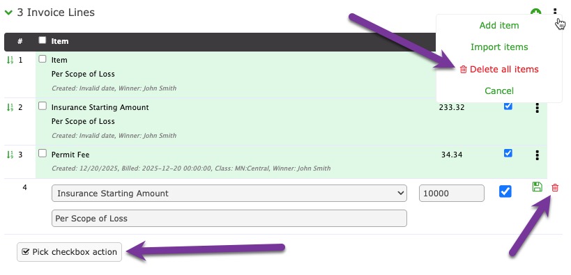 Invoice items can be deleted individually by clicking the trash icon, or by bulk via the menu item or checkbox action button.