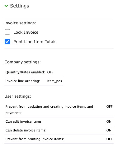 This is a reference to any Company Settings related to the Invoice. Changes to these settings are done within Invoice Settings, Company Settings.