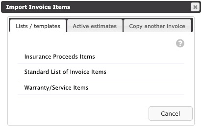 Items can be imported from an Invoice List/Template, an active Estimate, or from another Invoice.