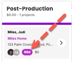 Project Board Day Pills The Day Pill shows how many days the project has been in its current status. 0-6 days (No pill shows) 7-20 days (Grey pill) 21+ days (Purple pill)