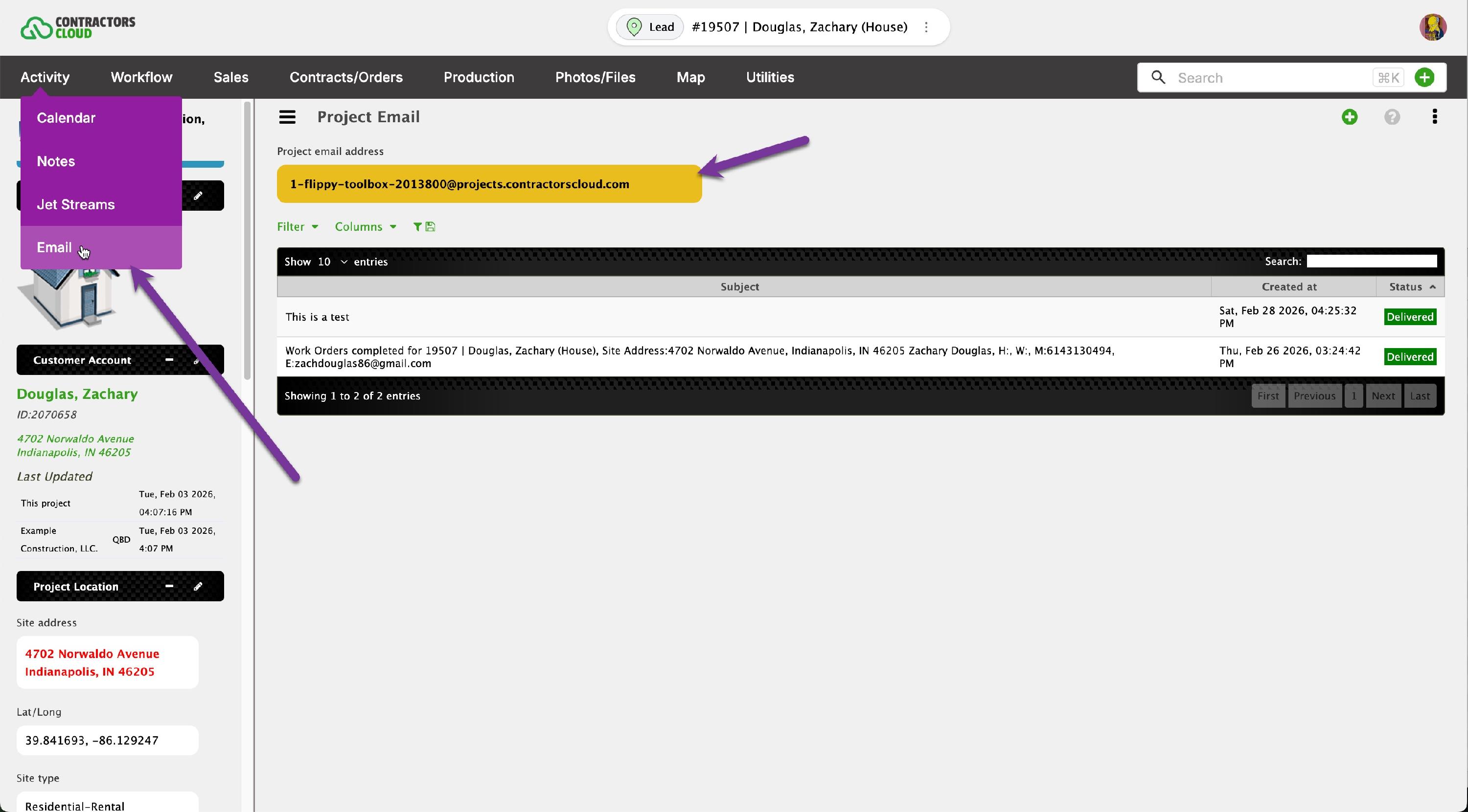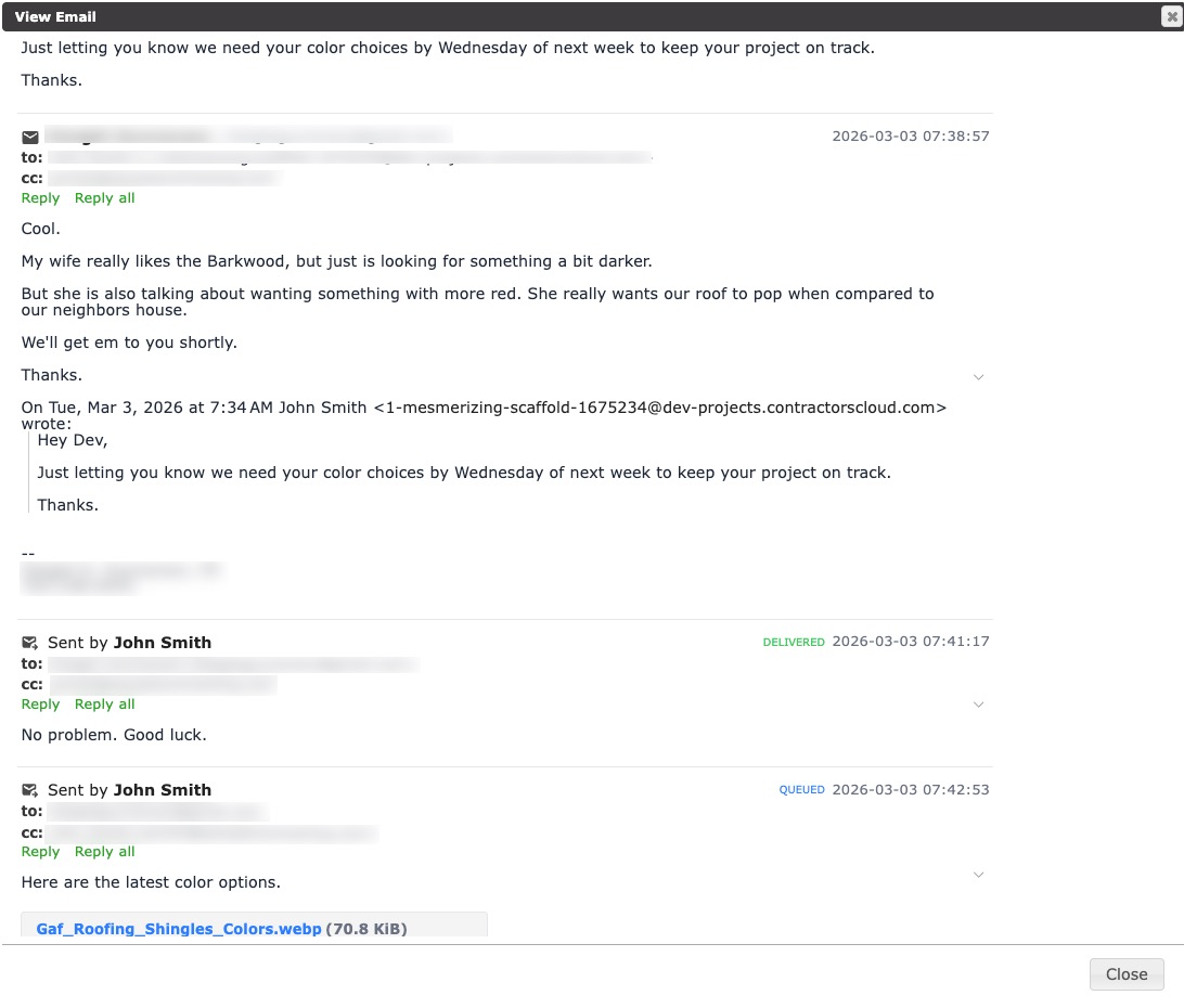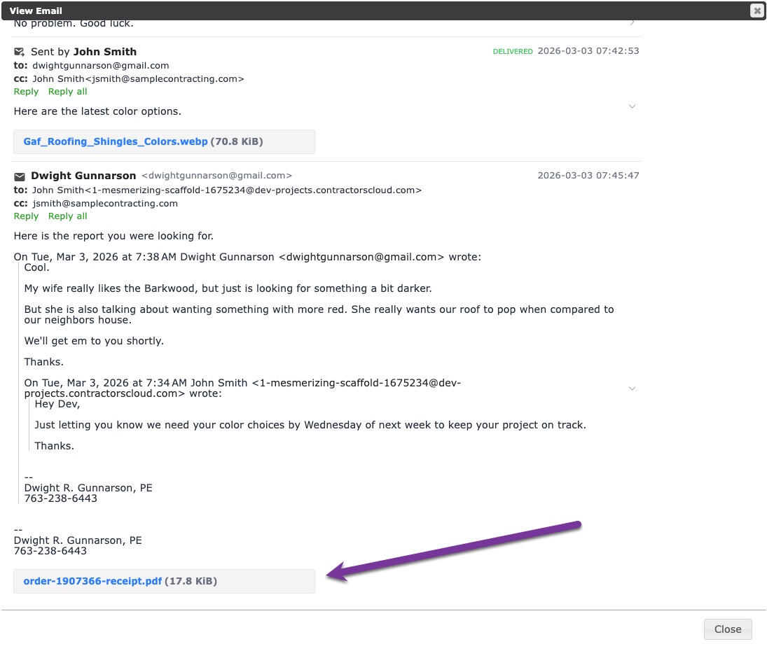 Whenever the project email address is included as a recipient in any email, the conversation will be recorded within the Contractors Cloud project.