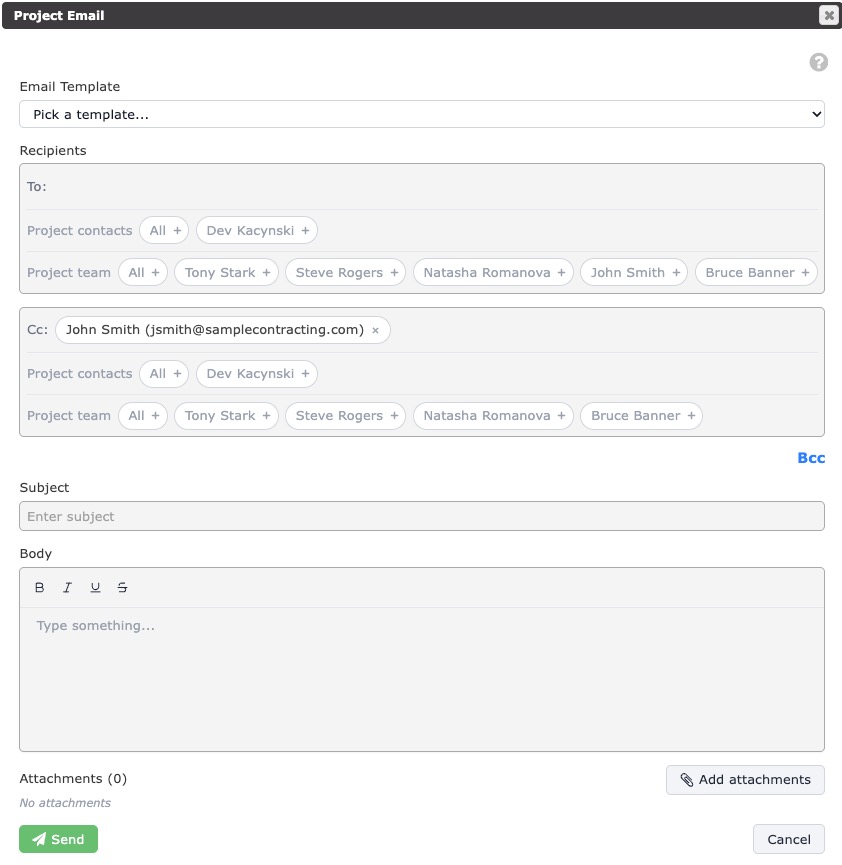 Our email dialog is designed to operate like any other email system. You can add and carbon copy recipients and upload attachments from your Project Files, Project Photos, or your device.