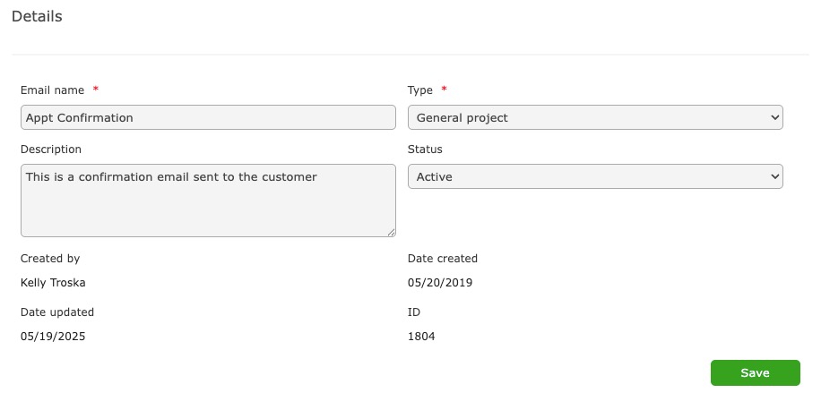 The type of email template governs email content options. Workflow type templates can be used within Company Milestones.