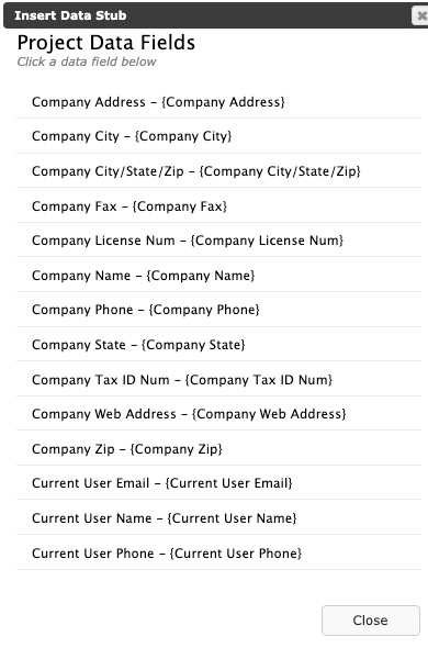 Data stubs are bracketed fields that represent real project data. When the email is composed within the Project, project data will automatically fill in the data stub.