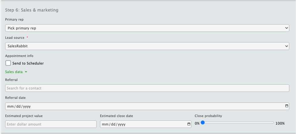 This is there a Primary Rep, Lead Source, and additional sales data is entered.