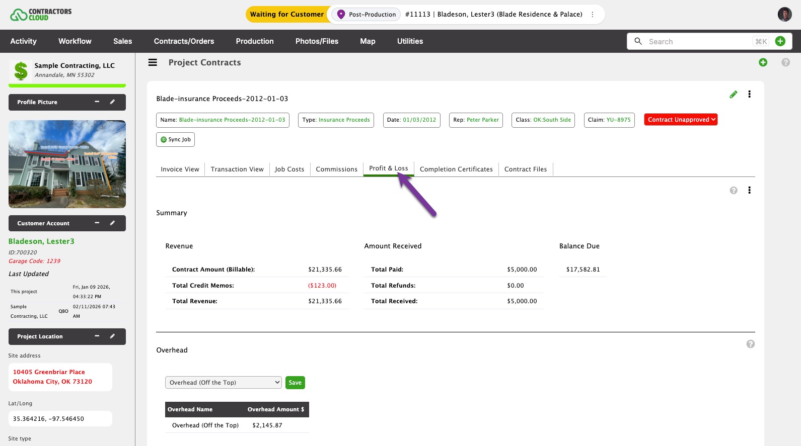 The Contract Profit & Loss tab shows various financial summaries and is where the Contract Overhead is set.