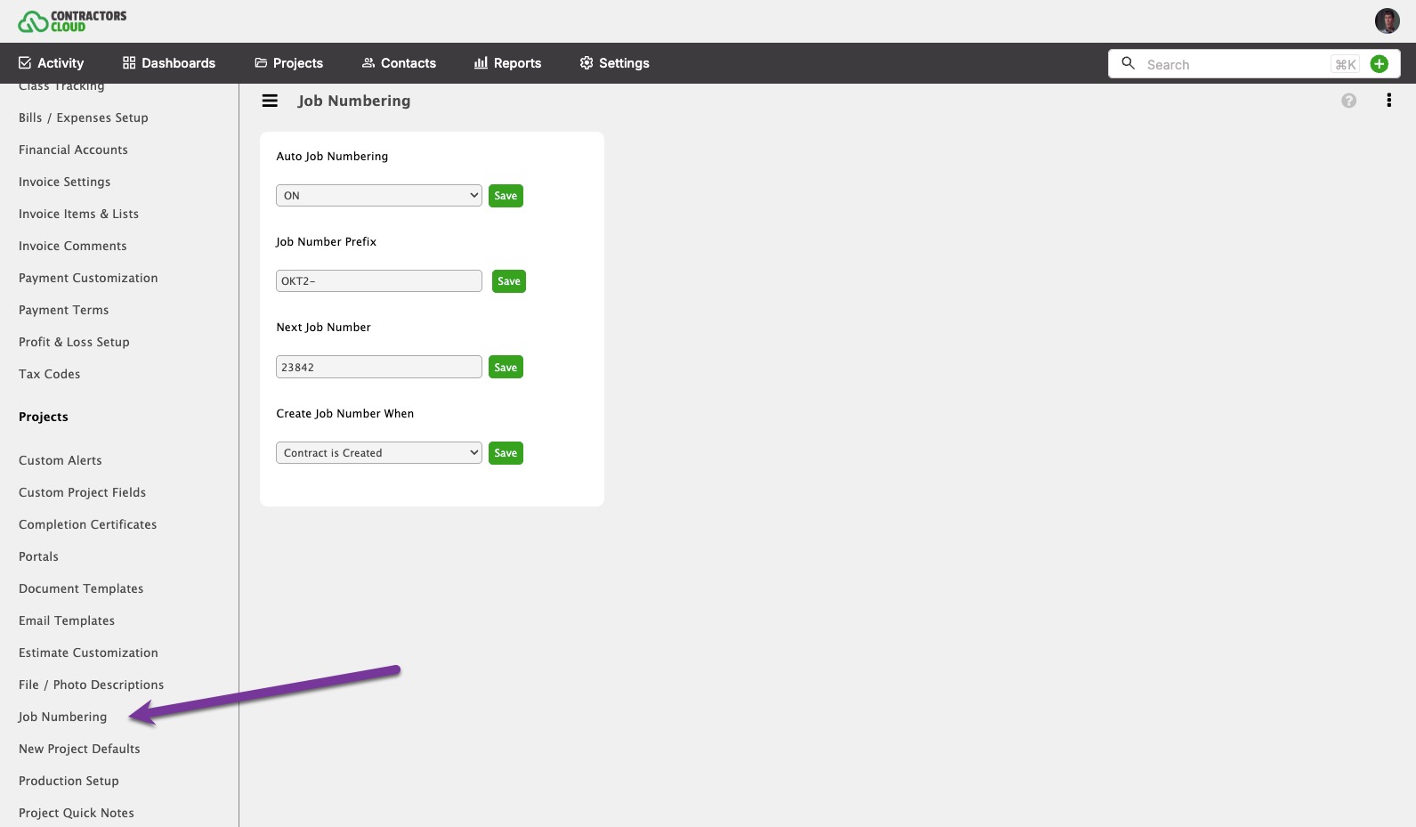 Custom Job Numbering is setup in Company Settings (permission required). This area allows you to manage and automate how your jobs/projects are numbered.