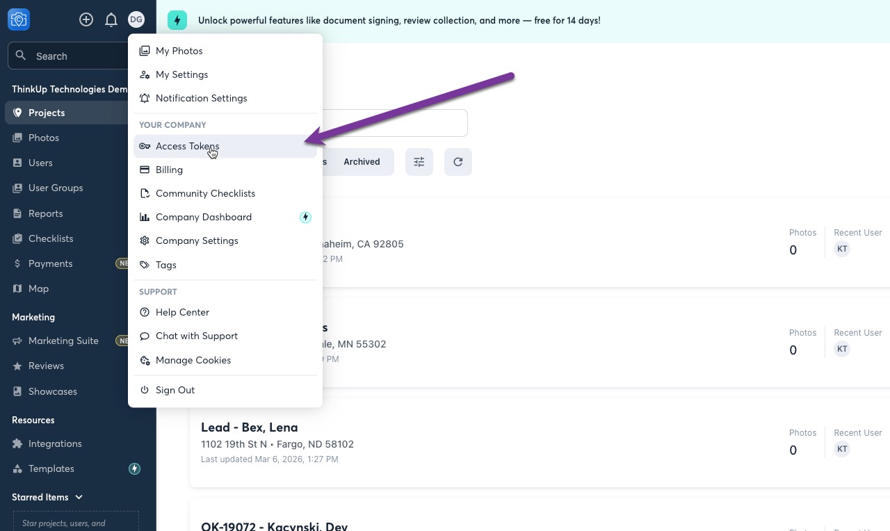 First, sign into your CompanyCam account, and navigate to Access Tokens.