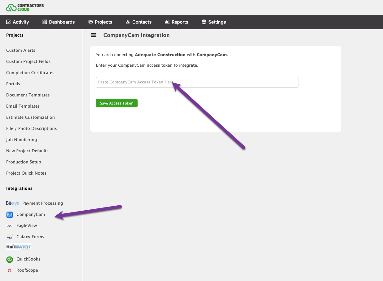 Within Company Settings, CompanyCam (permission required), paste the CompanyCam Access Token into and click Save Access Token. Multiple Contractors Cloud Companies can be connected to a single CompanyCam account if desired.