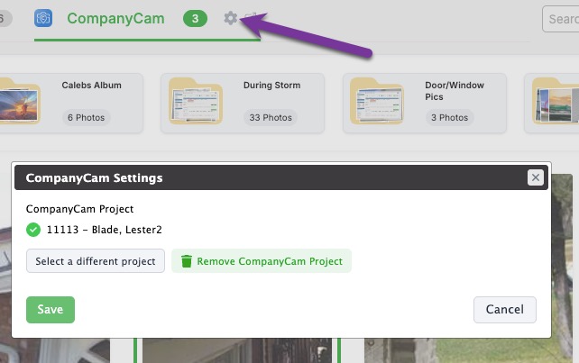 Click the gear settings to connect this CompanyCam project to a different Contractor Cloud project.