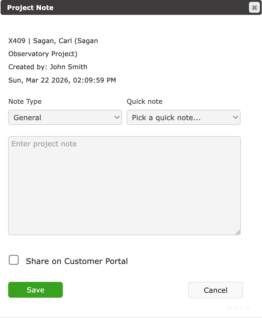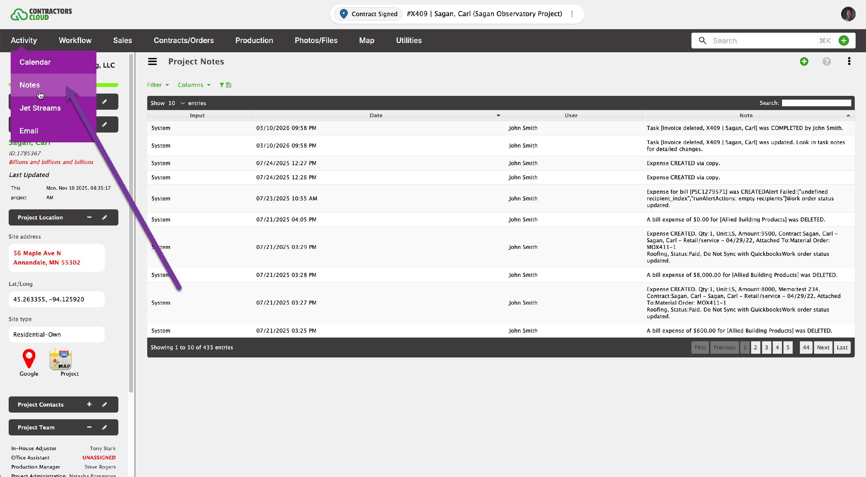 Project Notes is the primary log that lists everything has happens to the Project.